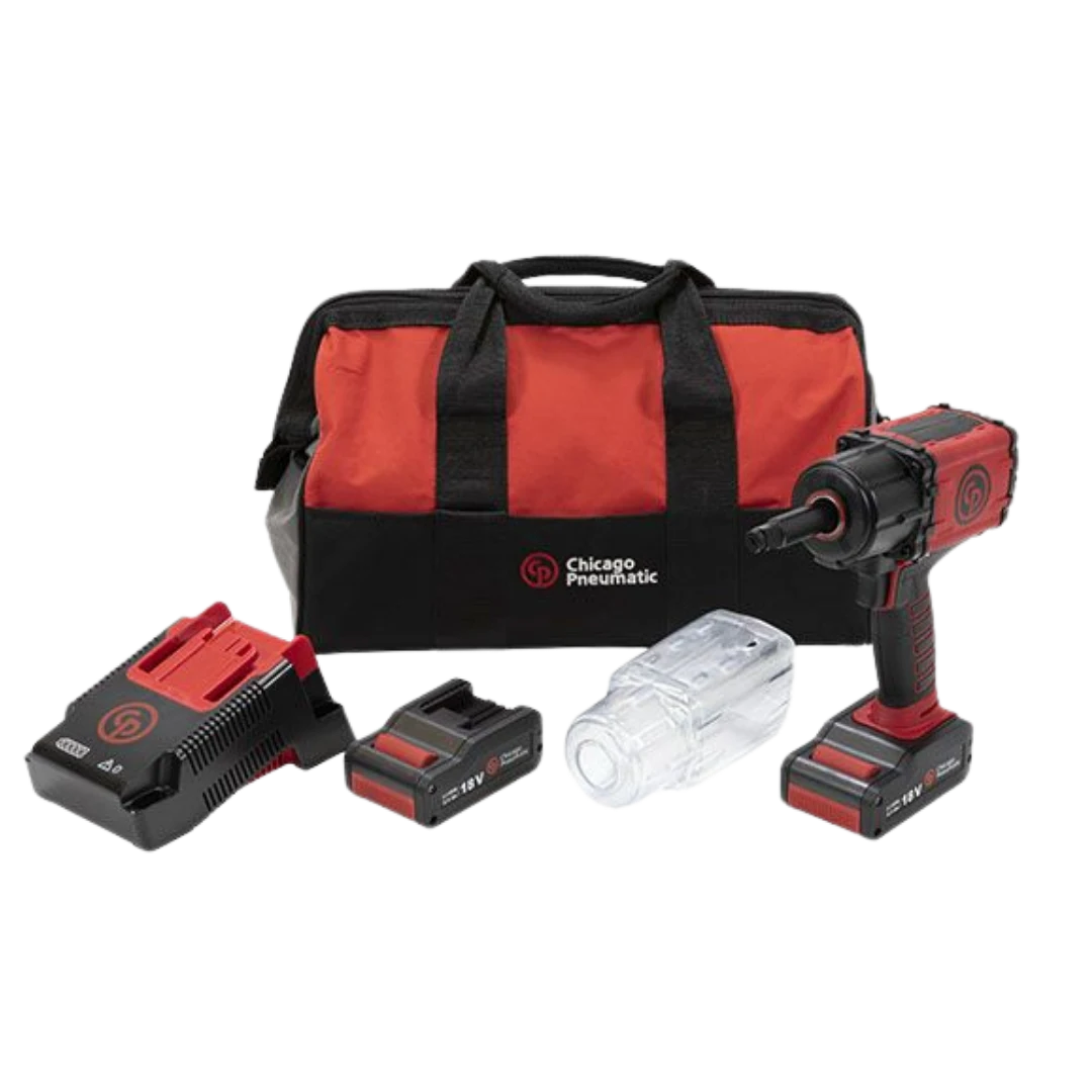 Chicago Pneumatic CP8854, servisler için geliştirilmiş yüksek torklu akülü somun sıkma makinesinin tam set halidir.