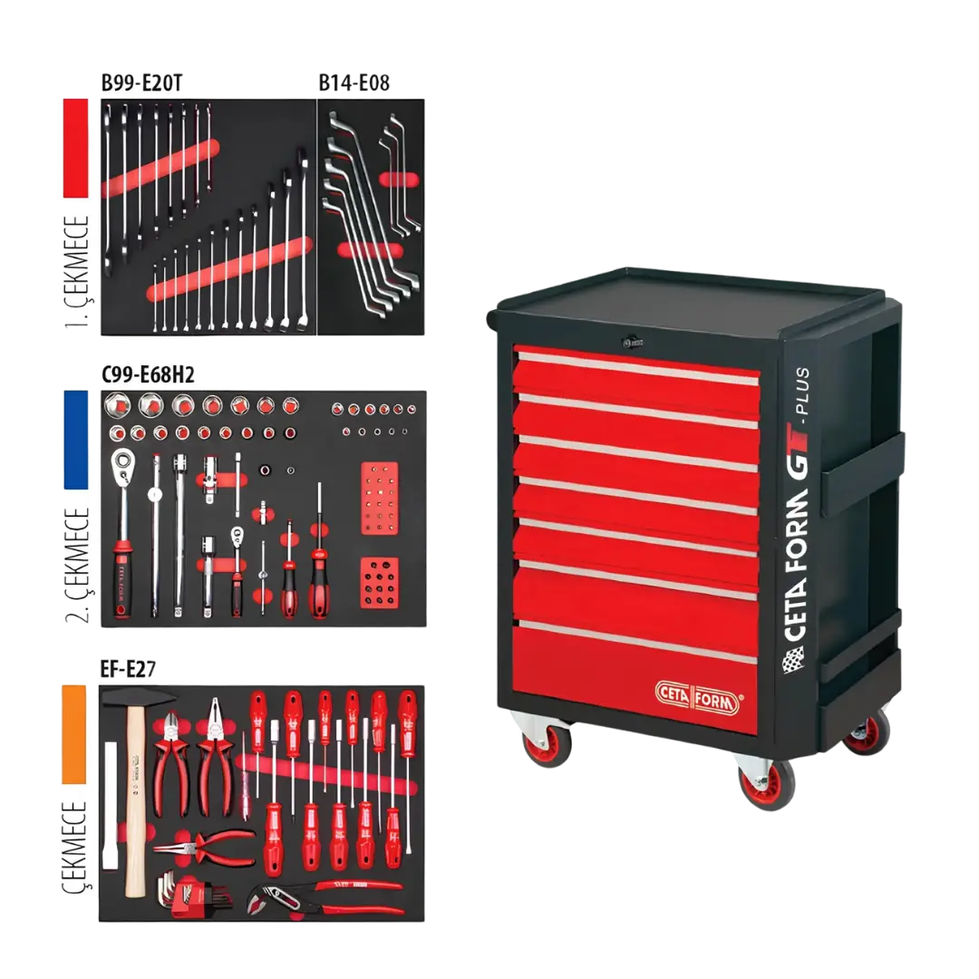 2. Çekmece: C99-E68H2; 68 Parça 1/4’’+ 1/2’’ 6 Köşe Lokma Takımı + Bits Uçlar 3. Çekmece: EF-E27; 27 Parça Alet Seti Çekiç, Pense Grubu, Düz – Yıldız – Lokma Uçlu Tornavida Seti, L Allen Anahtar Seti |
