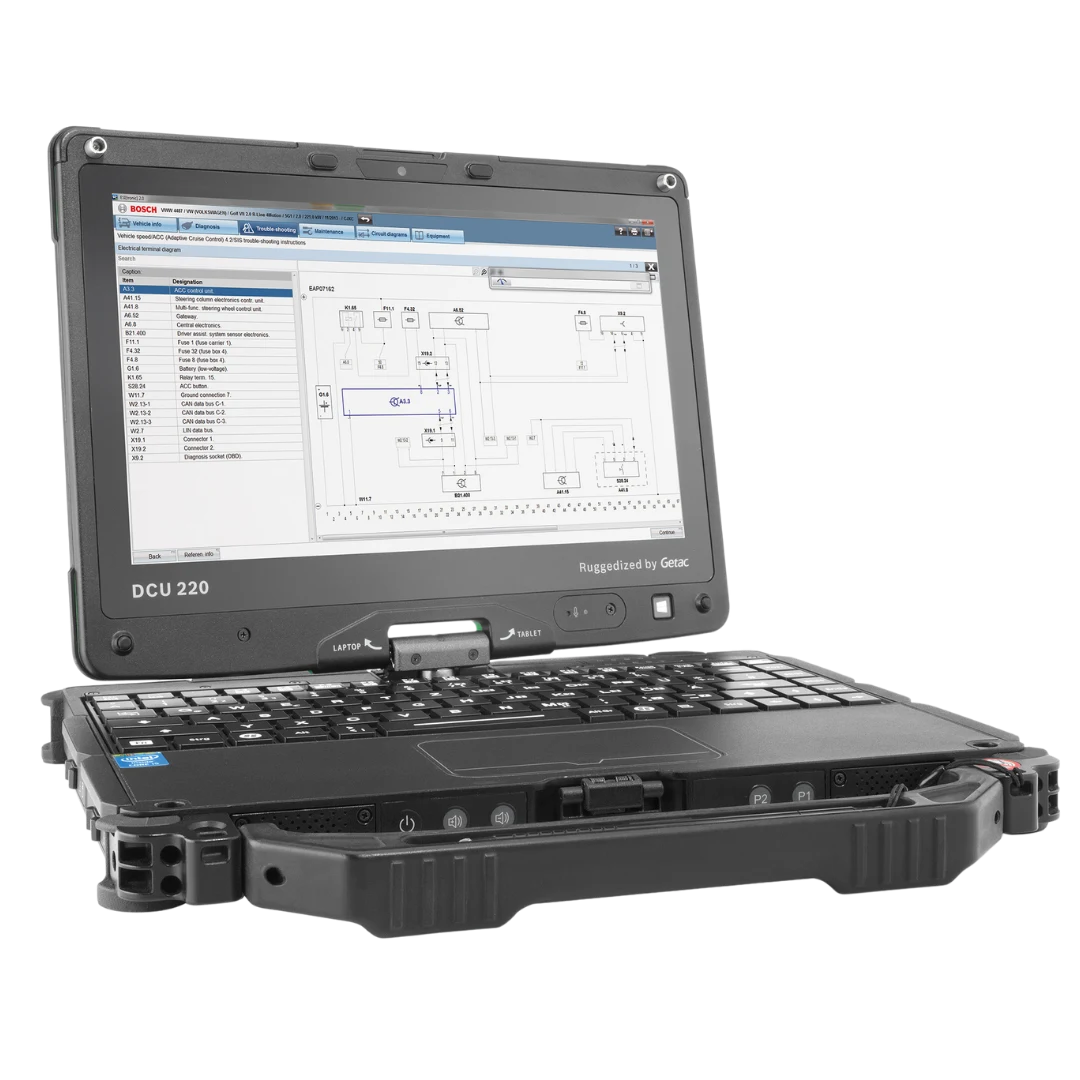 Bosch DCU 220 diagnostik laptop, servis koşullarına özel olarak geliştirilmiş darbeye dayanıklı yapısı ve güçlü donanımı ile tüm Bosch test ve arıza tespit sistemlerini yönetmenizi sağlar.
