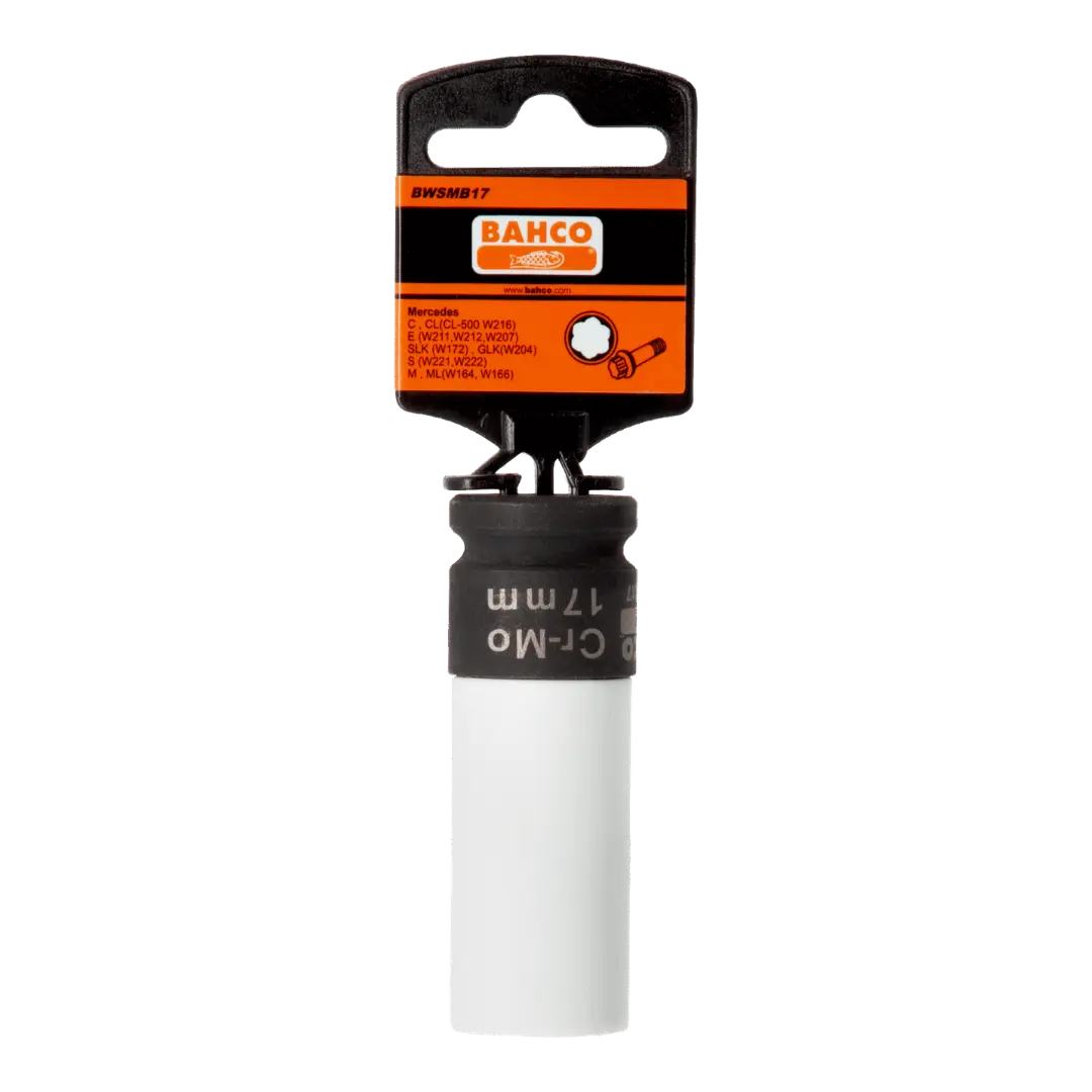 Bahco 17mm darbeli lokma, Mercedes ve Maybach araçlarda kullanılan özel bijon somunlarını sökmek için geliştirilmiş profesyonel bir lokmadır. Jant ve somun korumalı yapısı ile güvenli kullanım sağlar.