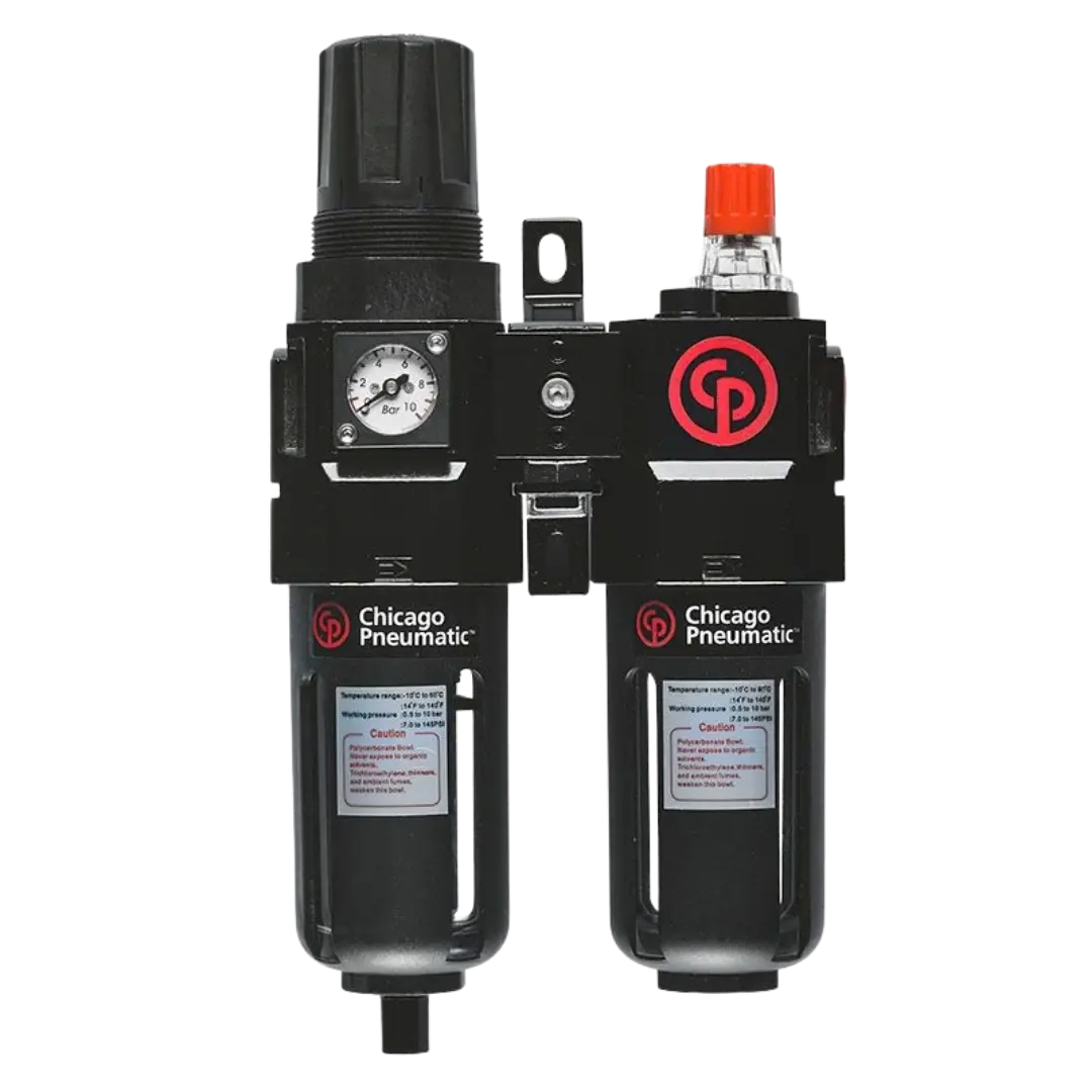 Chicago Pneumatic 1/2” Composite FRL, pnömatik sistemlerde hava kalitesini artırmak ve basıncı kontrol altında tutmak için geliştirilmiş filtre + regülatör + yağlayıcı (FRL) ünitesidir.