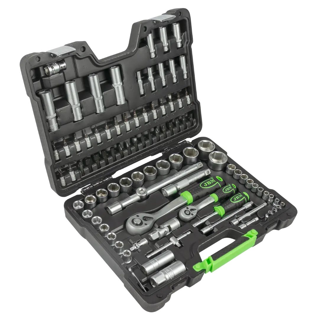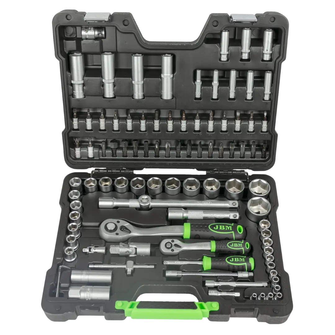 JBM 94 parça lokma seti, 1/4” ve 1/2” sürücü ölçüleri ile geniş kullanım alanı sunan kompakt ve profesyonel el aleti setidir. Dayanıklı CR-V çelik ve çinko kaplama yapısı ile uzun ömürlü kullanım sağlar.